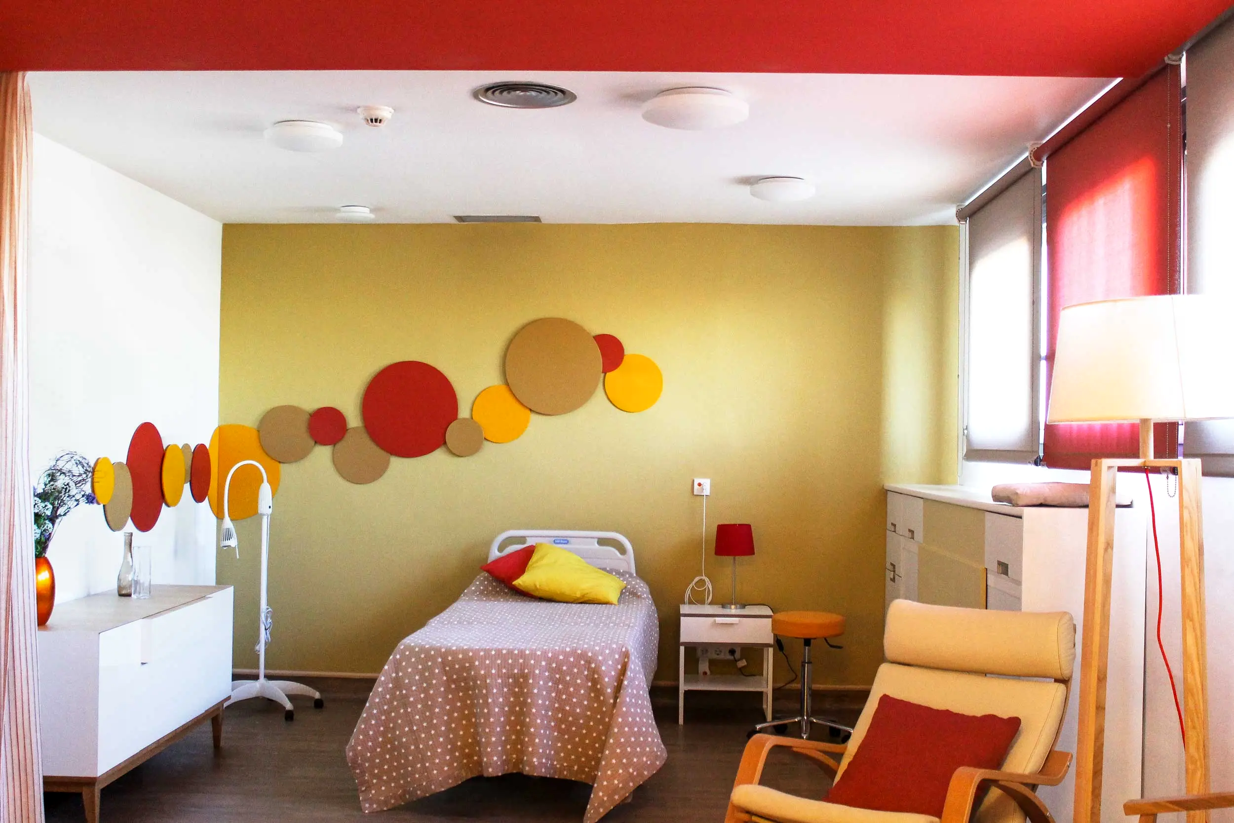 Un pequeño espacio para una posible atención al neonato, con el soporte de gases medicinales completa la habitación. Una bonita acuarela, con un motivo brasileño de una «rueda de la vida», pintada por Juan Manuel Herranz alegra la pared de la bañera y genera el motivo decorativo que después se repite en la puerta del baño, y en la señalización de la sala.